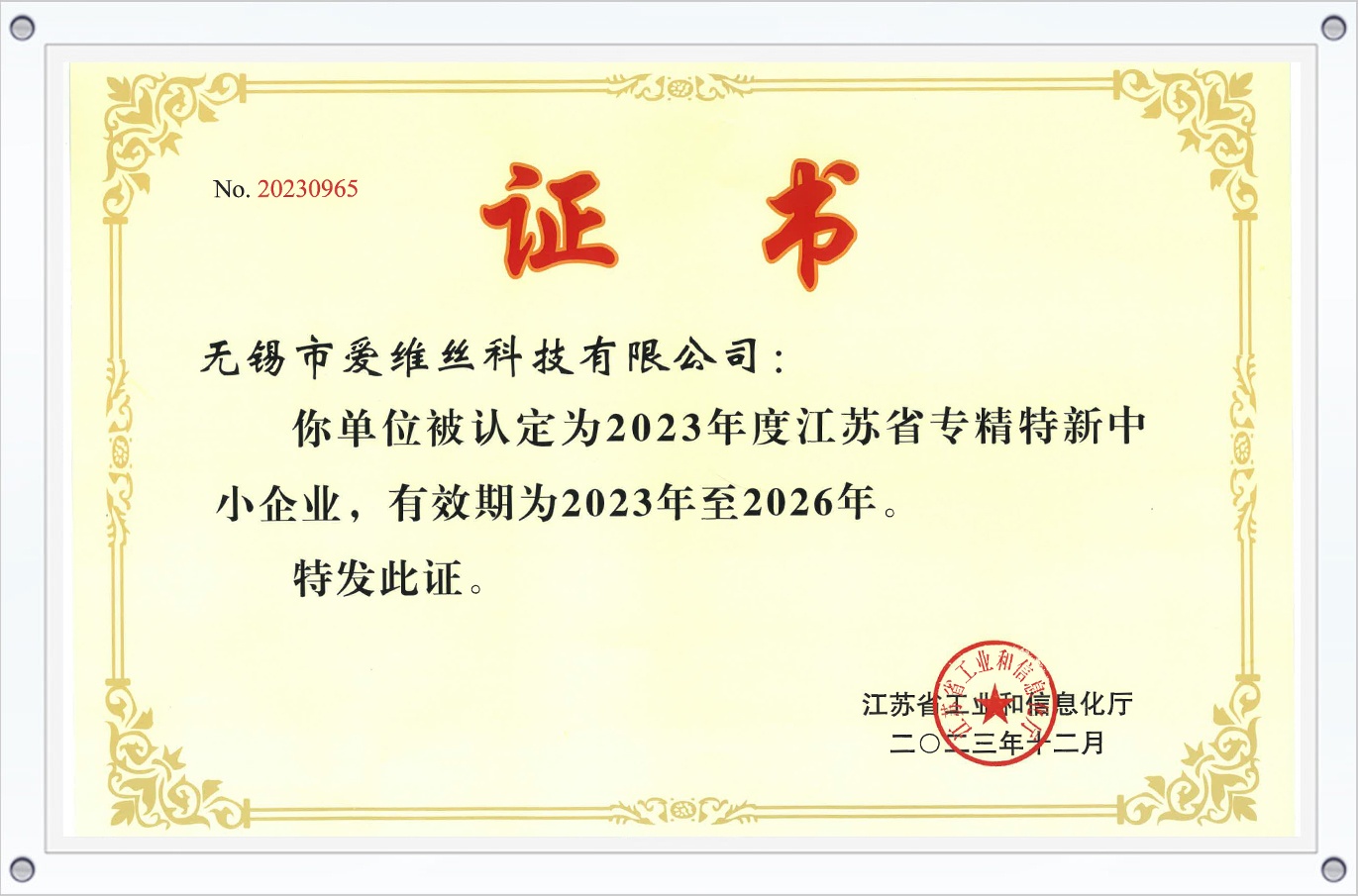 江蘇省專(zhuān)精特新中小企業(yè)證書(shū)