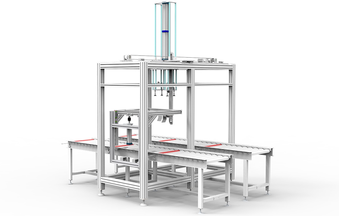 自動放內(nèi)襯機通過人工放內(nèi)襯至軌道上并輸送至響應(yīng)位置后,由多軸抓取裝置自動將內(nèi)襯放置到紙箱中。