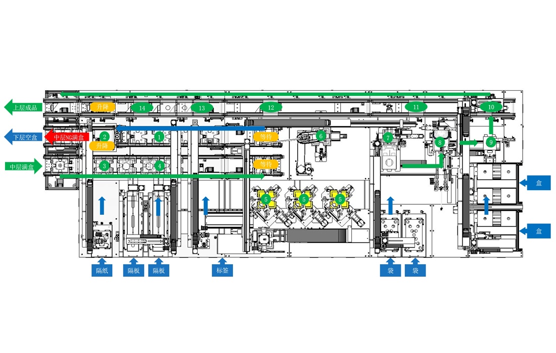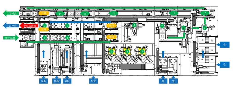 1、空盒放隔板;2、空盒放隔紙;3、滿盒放隔紙;4、滿盒放隔板;5、正片;6、視覺檢測;7、套袋;8、折袋;9、扣盒;10、產(chǎn)品翻轉(zhuǎn)出料;11、包裝檢測;12、頂升旋轉(zhuǎn);13、貼標(biāo);14、頂升旋轉(zhuǎn)。