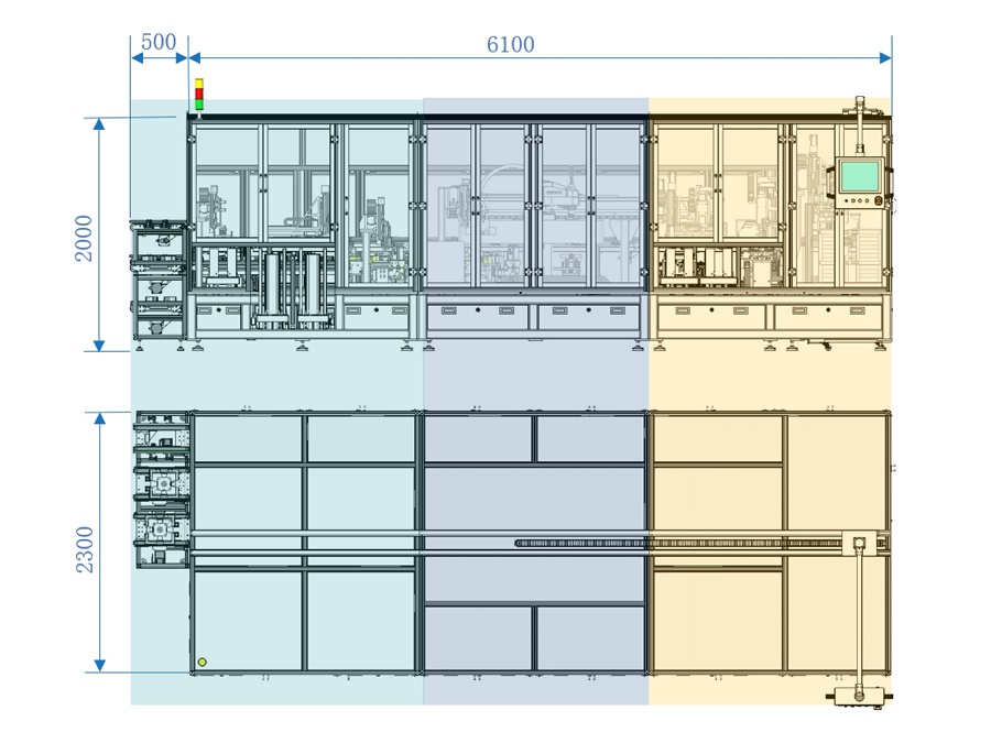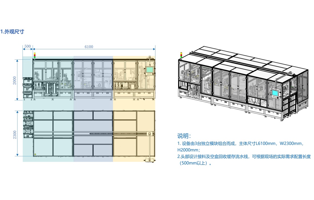 1. 設(shè)備由3臺獨(dú)立模塊組合而成,主體尺寸L6100mm,W2300mm,H2000mm;