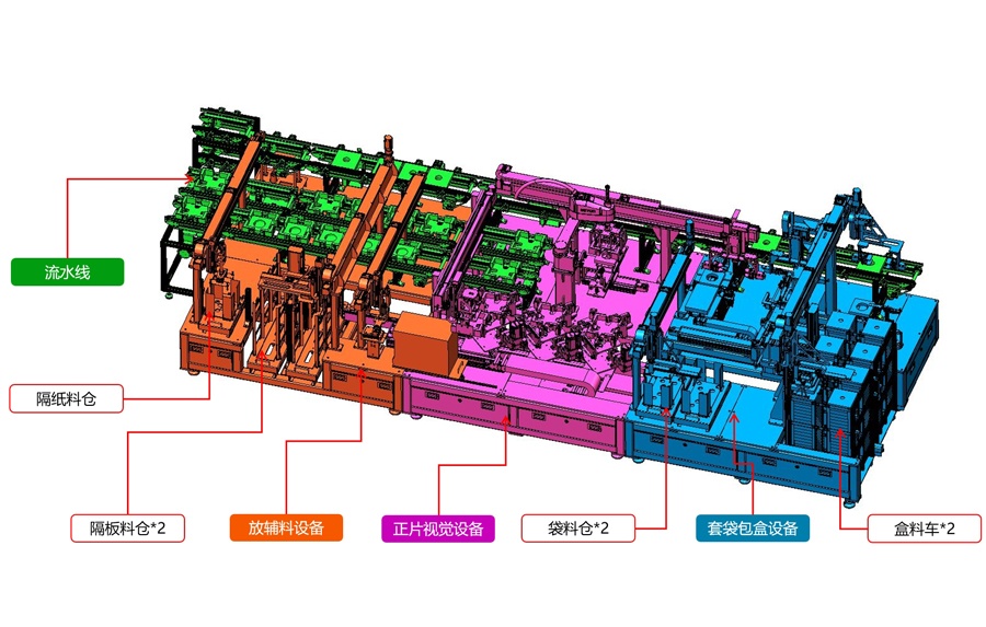 設(shè)備由放輔料設(shè)備、正片視覺設(shè)備、套袋包盒設(shè)備及流水線組合而成,主體尺寸L6100mm,W2300mm,H2000mm。