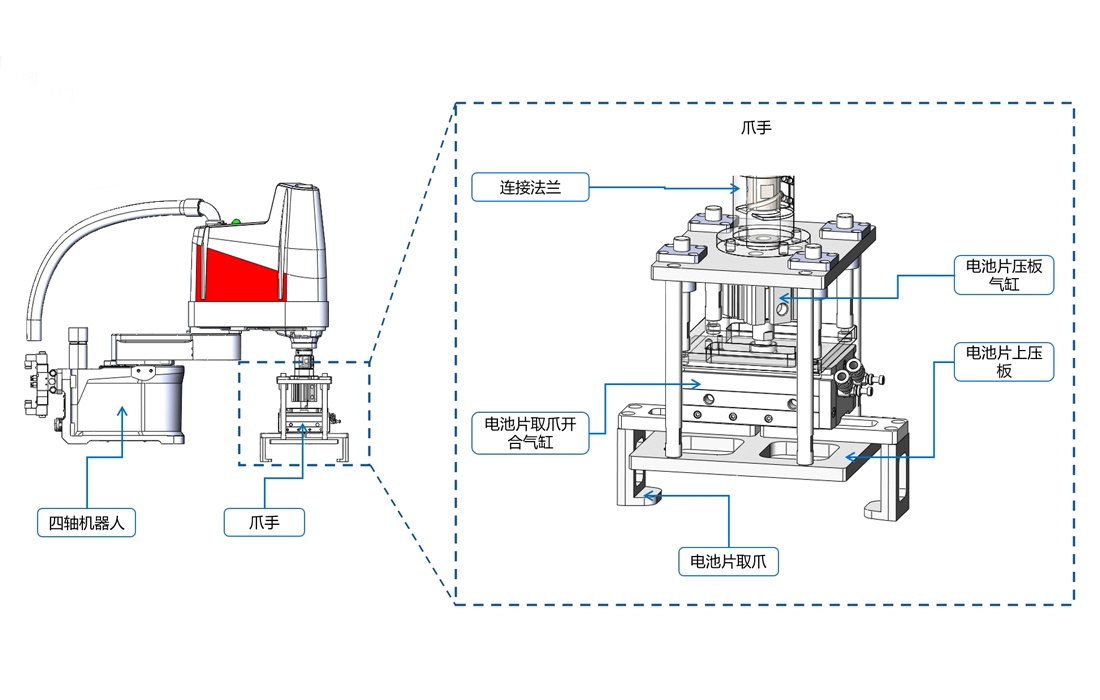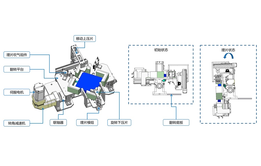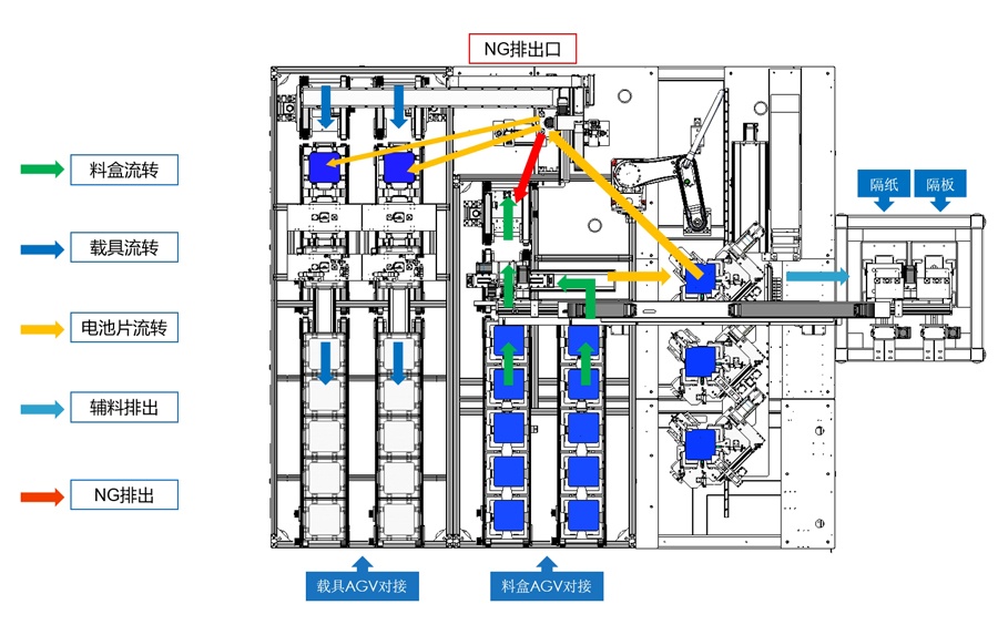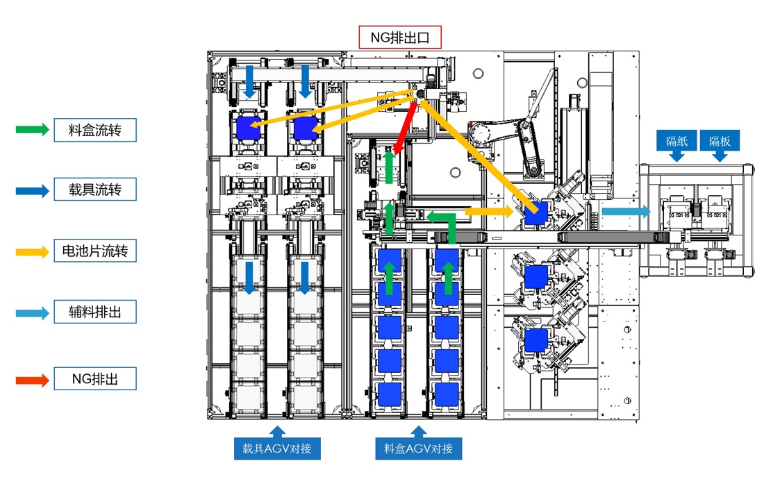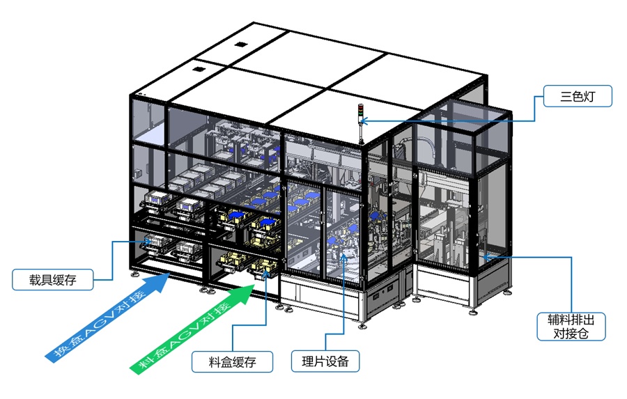 自動(dòng)將電池片從料盒取出放入專(zhuān)用載具,切換料盒;